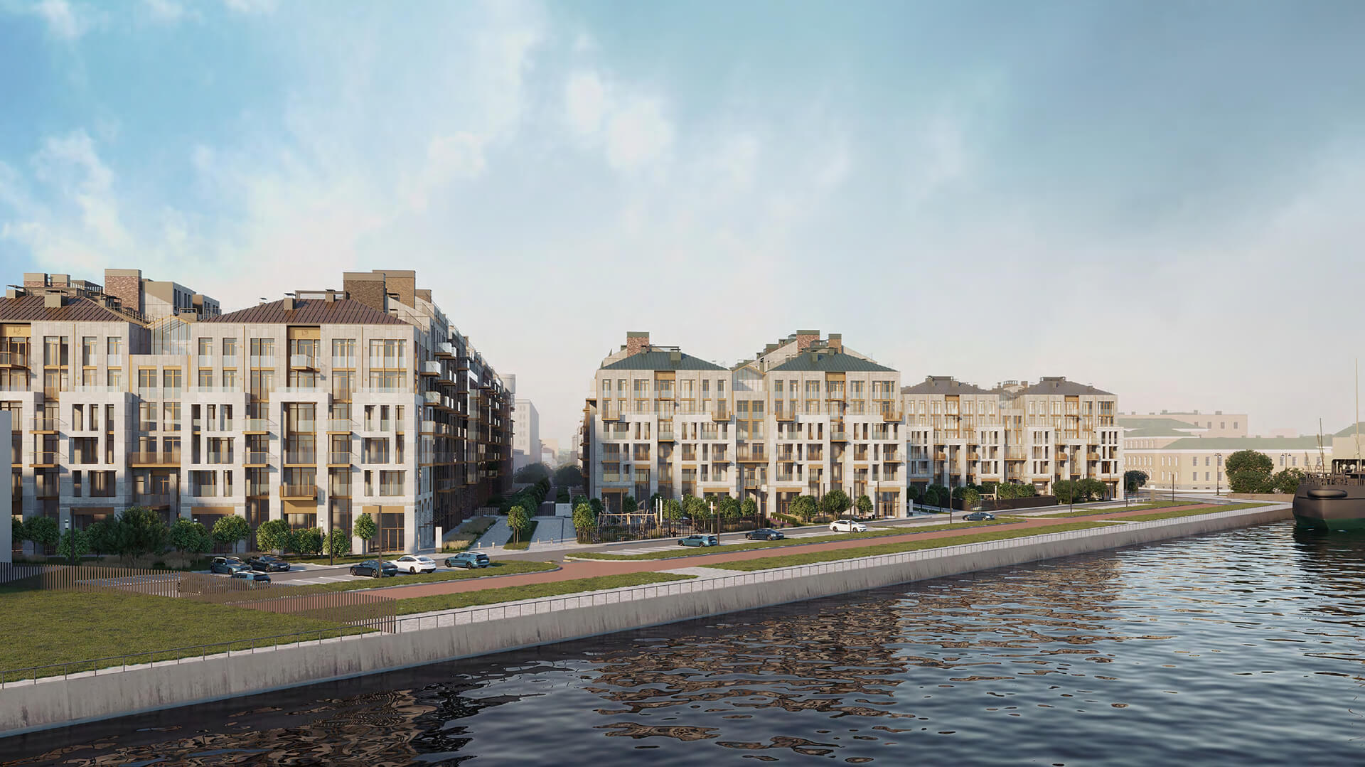 Корпуса разной этажности размещены ступенчато, чтобы максимально использовать панорамные виды на Неву и центр города. В проекте предусмотрены «парящие» балконы, французские окна и террасы, создающие дополнительное ощущение открытости и простора. Архитектура подчёркивает статус и респектабельность комплекса.