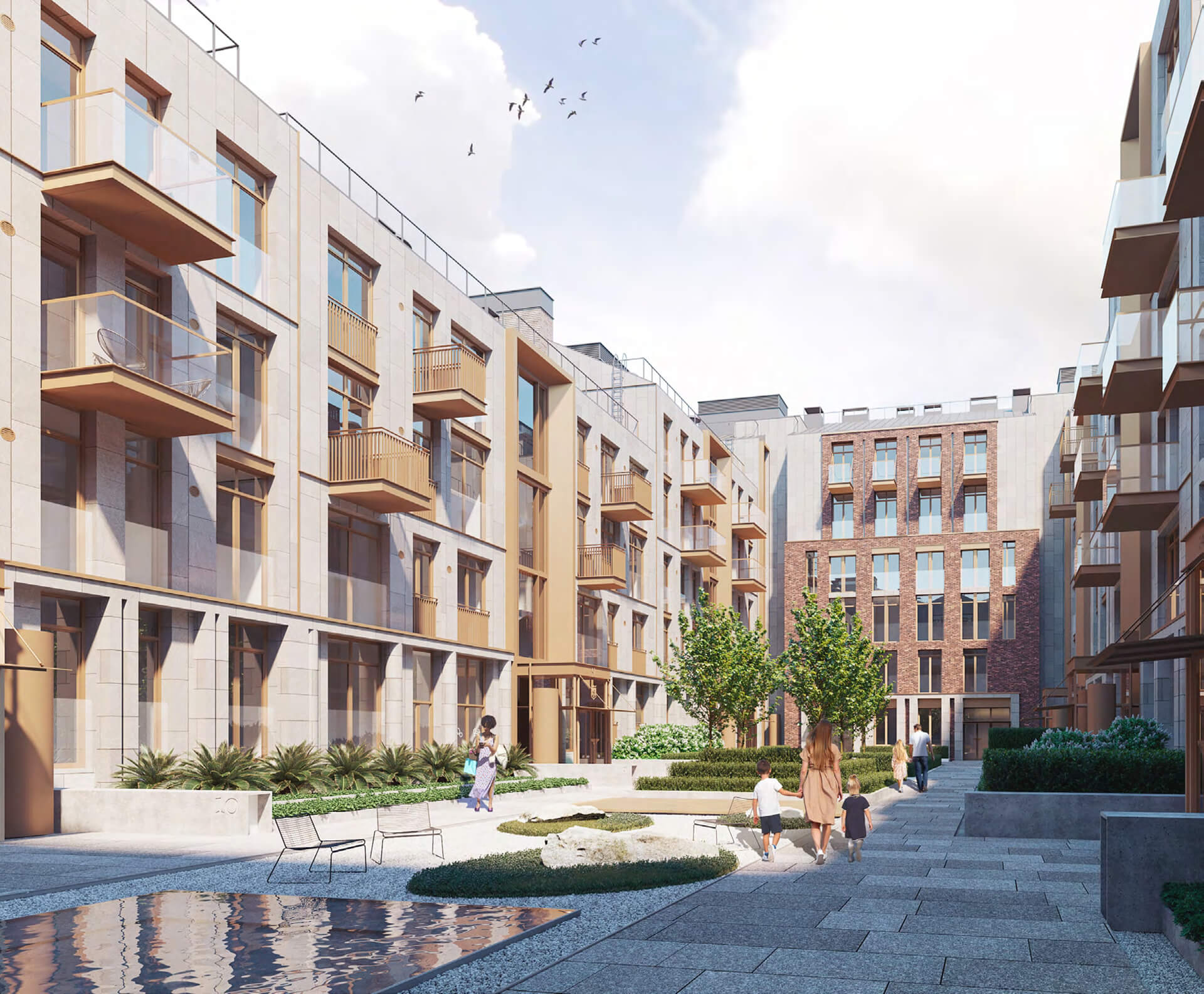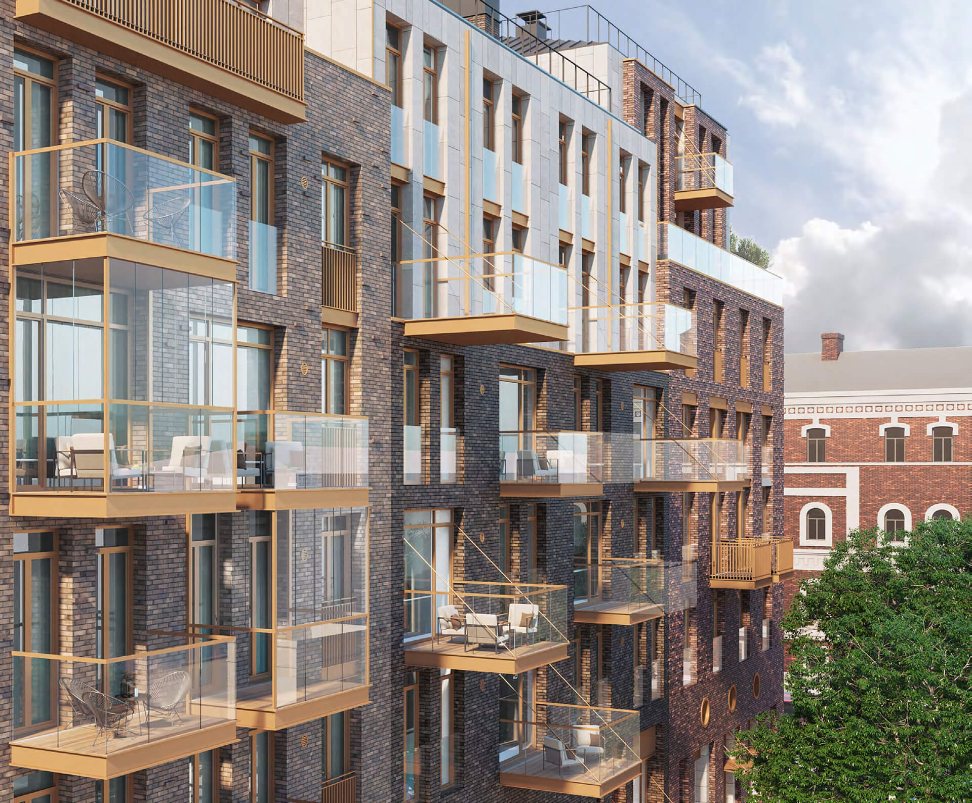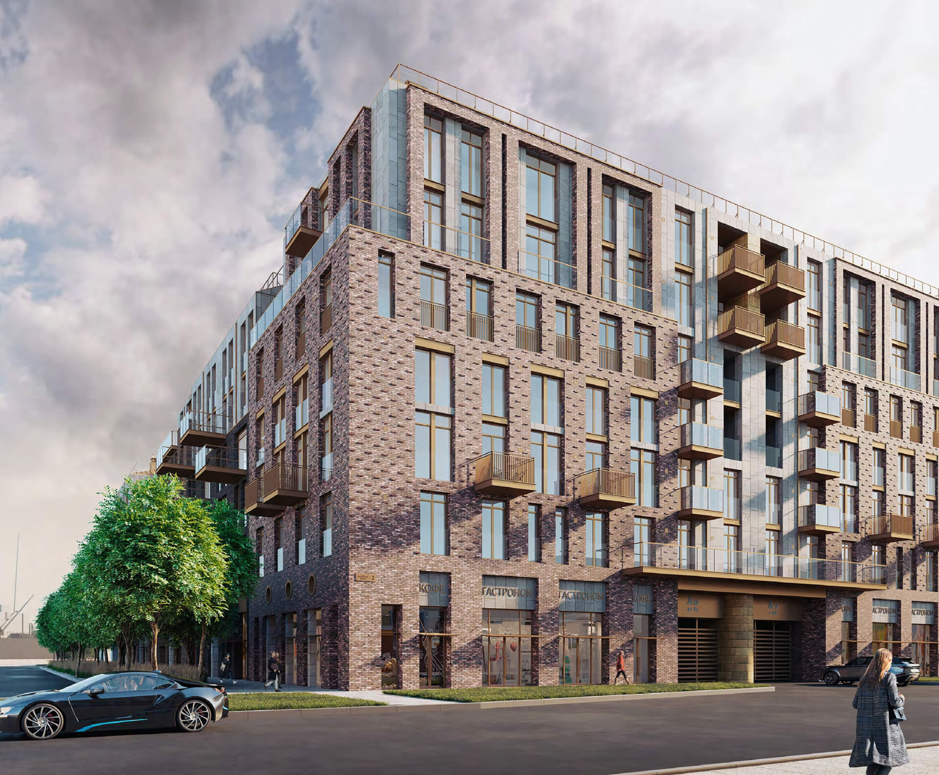Архитектурно–градостроительная концепция сочетает классику и современность: фасады из клинкера и натурального камня, «парящие» балконы и французские окна создают динамику объемов и много света. Интерьеры холлов выполнены с премиальной отделкой — дизайнерское освещение, двухуровневые входные группы с эскалаторами и лаунж-зоны усиливают впечатление роскоши и комфорта.