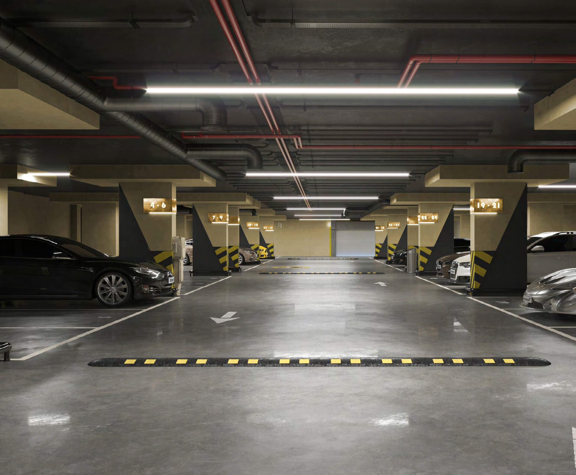 Также предусмотрены станции зарядки для электромобилей и помещения для хранения колёс и другого сезонного инвентаря. Паркинг интегрирован в общую архитектурную и инженерную концепцию проекта, подчеркивая высокий уровень комфорта.