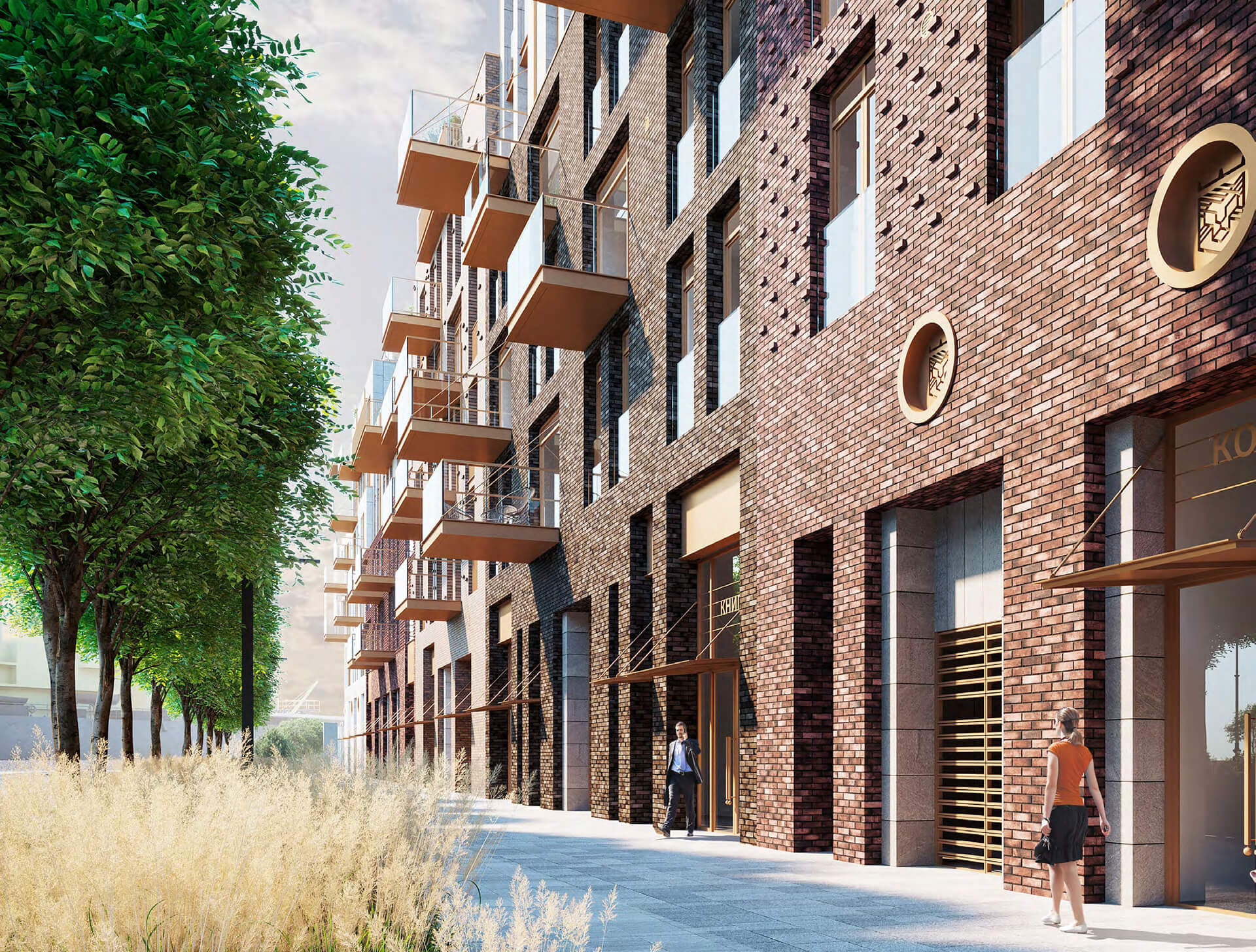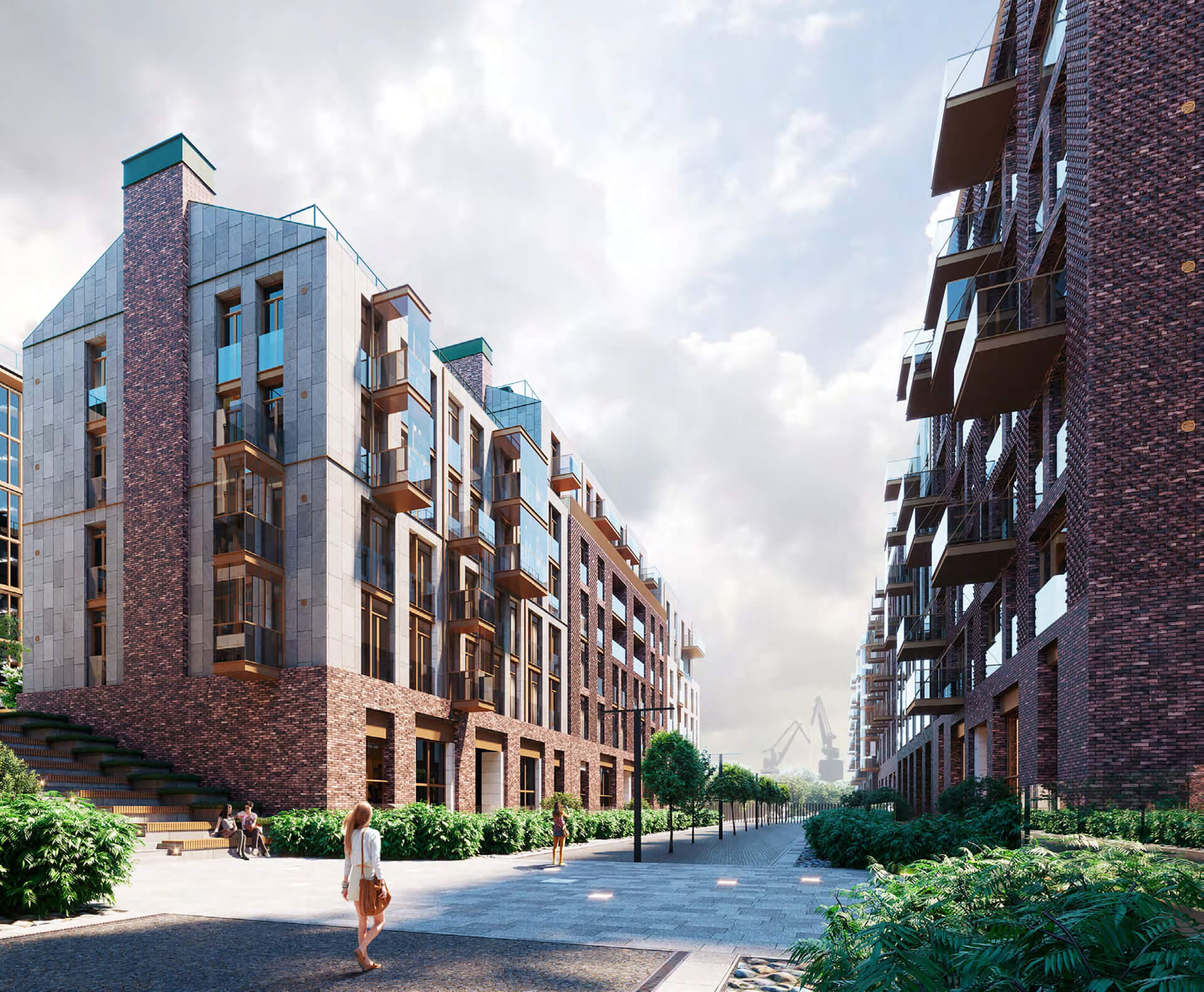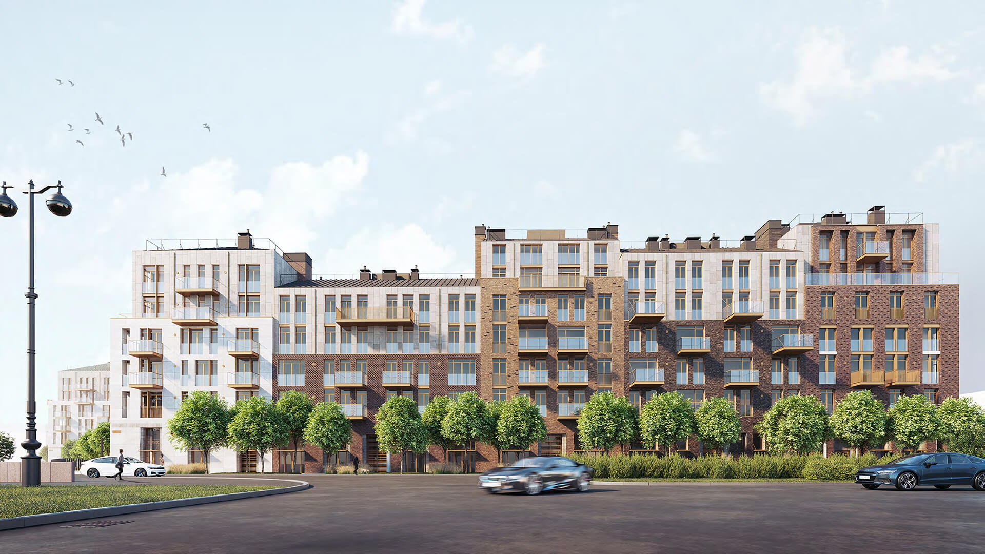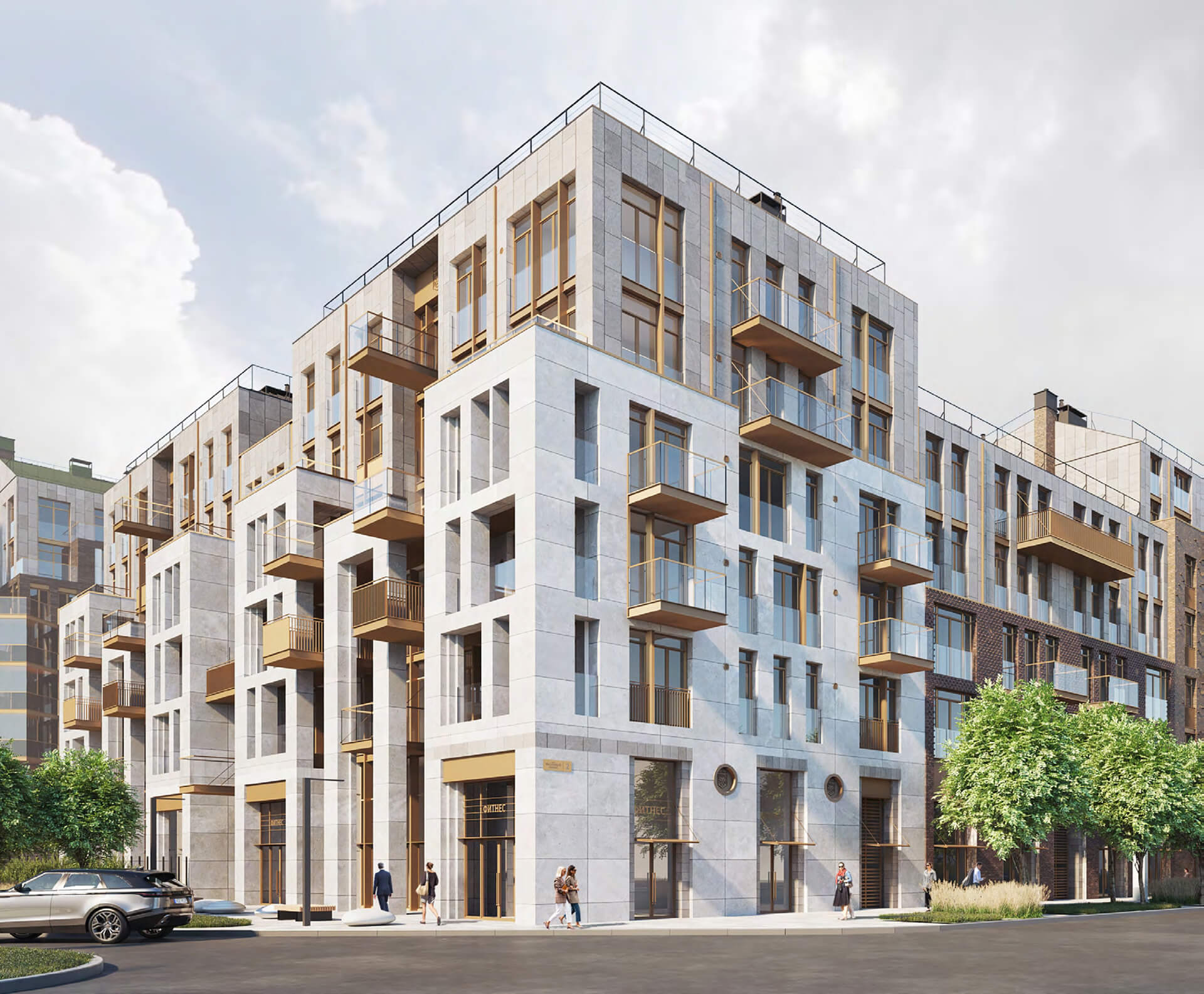 Архитектурно–градостроительная концепция сочетает классику и современность: фасады из клинкера и натурального камня, «парящие» балконы и французские окна создают динамику объемов и много света. Интерьеры холлов выполнены с премиальной отделкой — дизайнерское освещение, двухуровневые входные группы с эскалаторами и лаунж-зоны усиливают впечатление роскоши и комфорта.