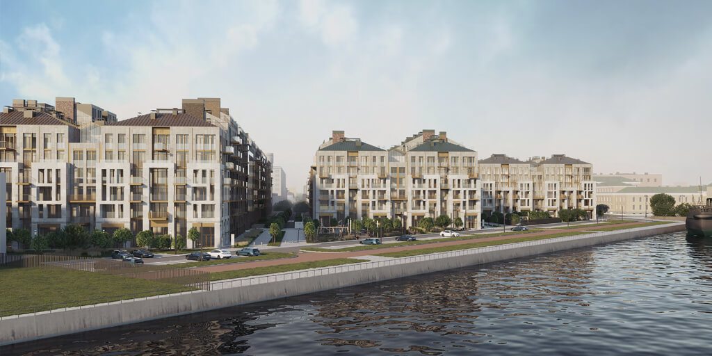 Корпуса разной этажности размещены ступенчато, чтобы максимально использовать панорамные виды на Неву и центр города. В проекте предусмотрены «парящие» балконы, французские окна и террасы, создающие дополнительное ощущение открытости и простора. Архитектура подчёркивает статус и респектабельность комплекса.